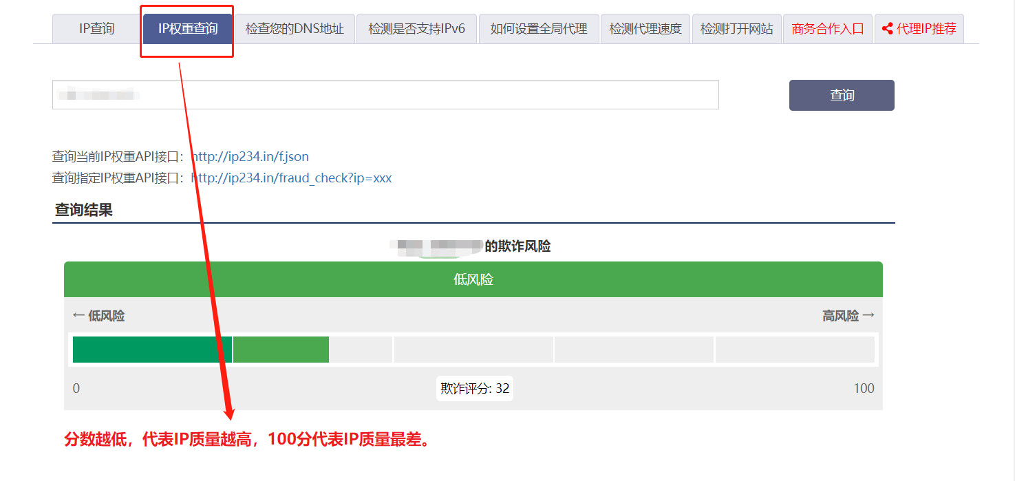 (1)IP纯净度测试 : https://www.ip123.in/ 输入自己IP,进行查询 IP越干净显示值越低。